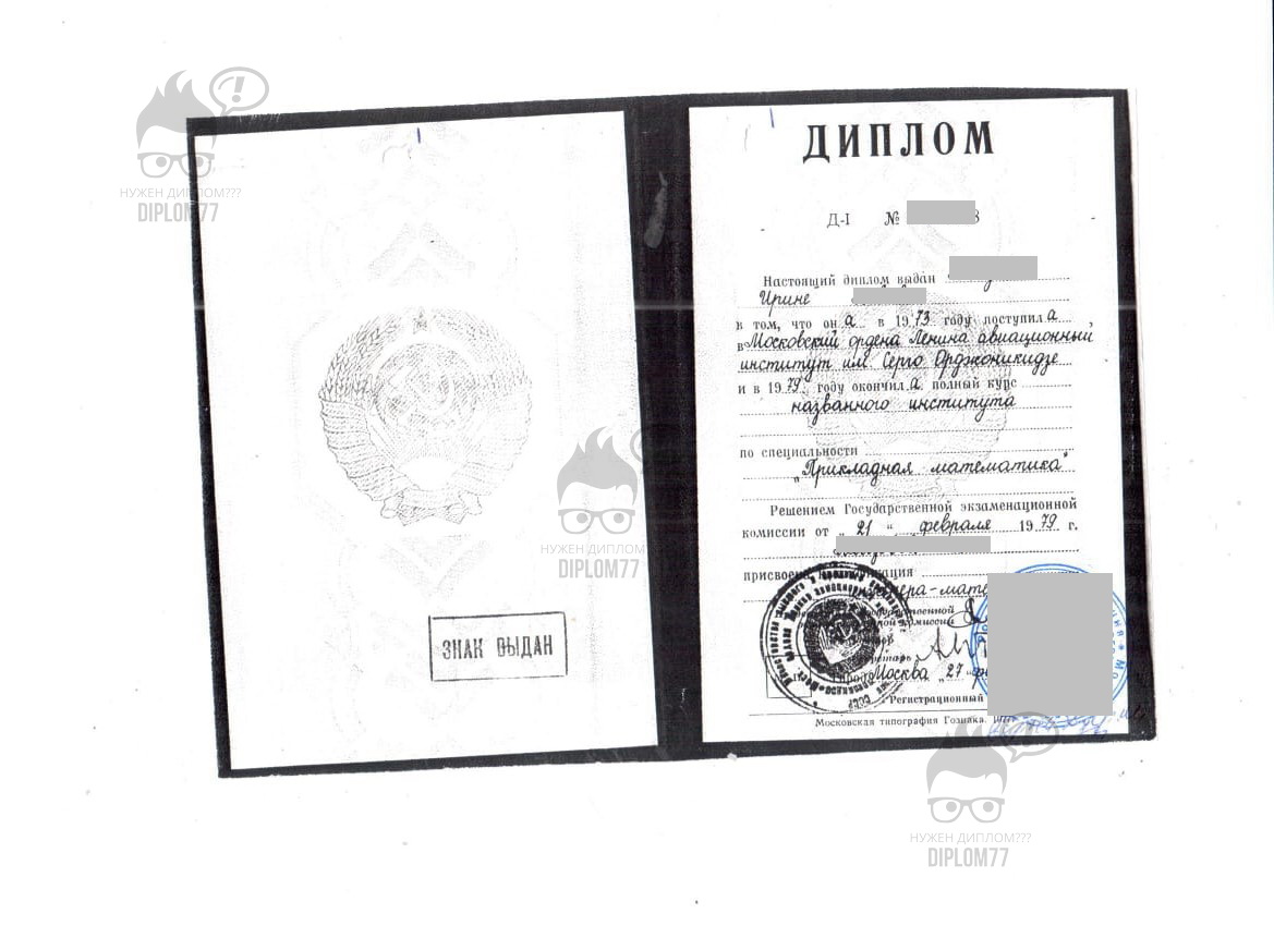 Диплом считается очень важным официальным документом. Он нужен человеку на протяжении всей его жизни. Часто можно услышать об утрате этой бумаги бывшими гражданами СССР. И тут появляется серьёзная проблема, часто неразрешимая. Восстановить его практически невозможно. Часто сам ВУЗ или не существует или находится на территории другого государства. Но для нас нет проблем изготовить такой диплом. Диплом77 готов Вам помочь купить диплом советского образца (СССР).
