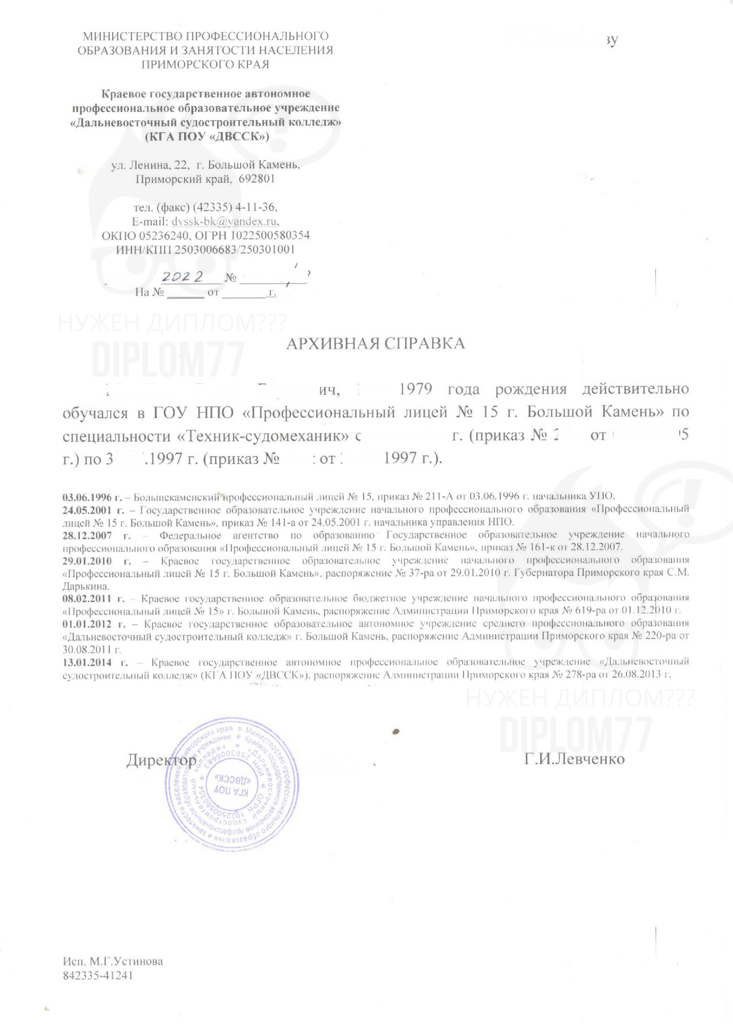 Ответ: Здравствуйте. Справка о прохождении обучения в училище (архивная) стоит 10 000 рублей. Делается за 1-2 рабочих дня и плюс время доставки. Заказать документ можно (текущая страница). Подробнее о вариантах оплаты и доставки здесь: https://diplom77go.cfd/dostavka